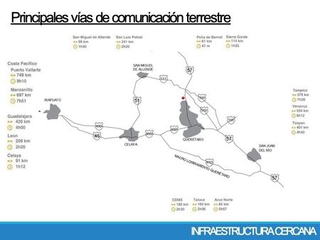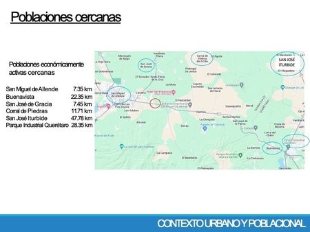 Además, se encuentra en una zona activa económicamente, cercana a importantes localidades como al pueblo de San Miguel de Allende a solo 7.35 kilómetros, Buenavista a 22.35 kilómetros, San José de Gracia a 7.45 kilómetros, Corral de Piedras a 11.71 kilómetros, San José Iturbide a 47.78 kilómetros y el Parque Industrial Querétaro a 28.35 kilómetros.