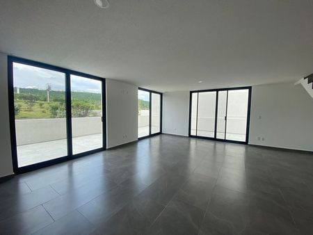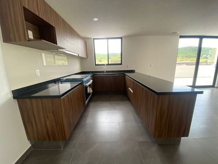 La cocina está equipada con acabados de alta calidad y una barra desayunador, perfecta para disfrutar de comidas informales. La sala-comedor cuenta con sonido ambiente, creando un espacio ideal para reuniones y momentos familiares.