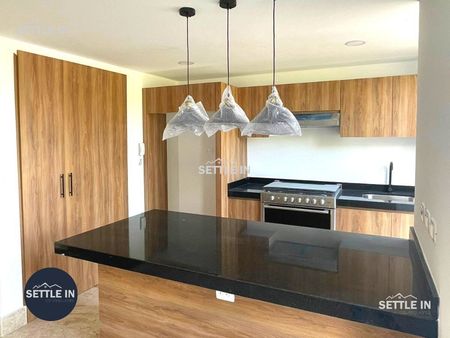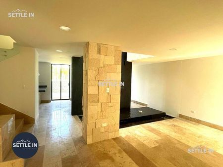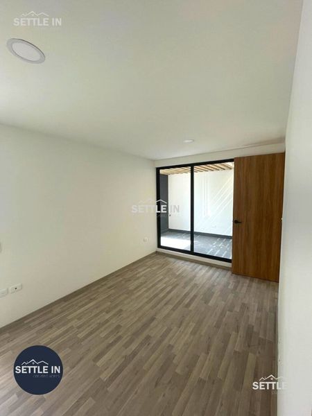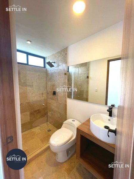 Planta baja. Sala, comedor, medio baño de visitas, cocina abierta equipada, recámara con baño completo, jardín y cochera para 2 autos.