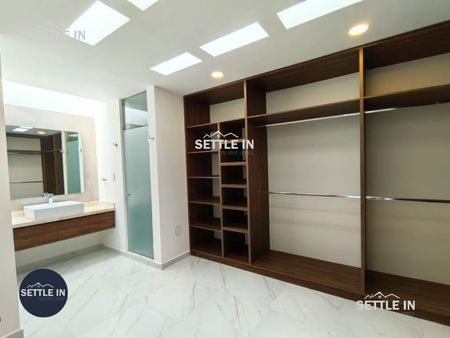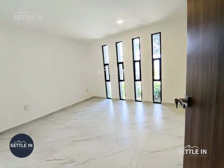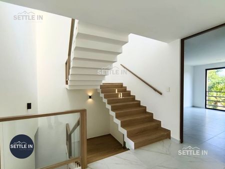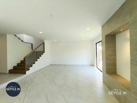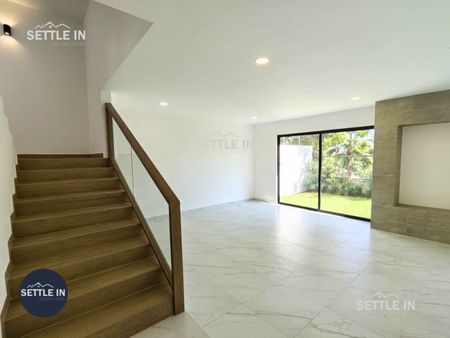- Planta baja: 50 m2 de área verde en parte delantera y trasera, amplio estacionamiento para dos autos techados, cocina totalmente equipada, despensa, bodega, closet de visitas, área de sala y comedor con vista al jardín, estudio, baño completo, cuarto de lavado y baño de servicio.