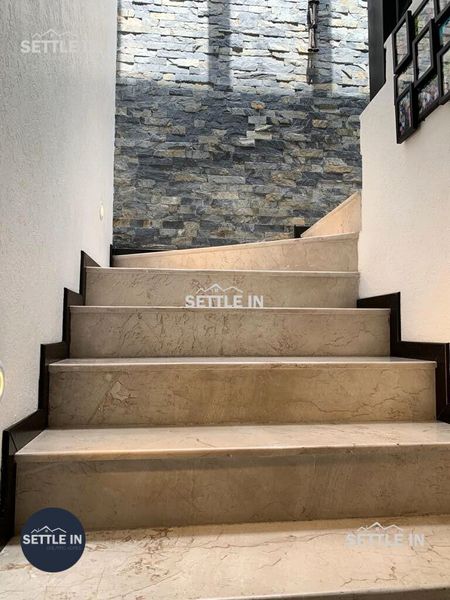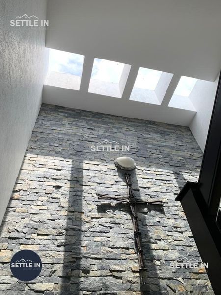 Duela en recámaras, piedra en muro de escalera, persianas e iluminación natural.