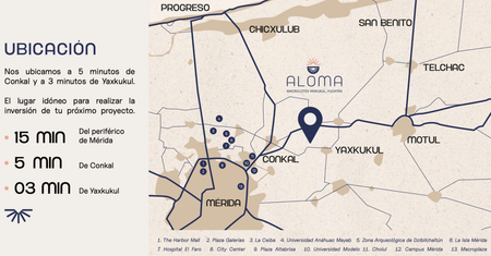 Nos ubicamos a 5 minutos de Conkal y a 3 minutos de Yaxkukul.