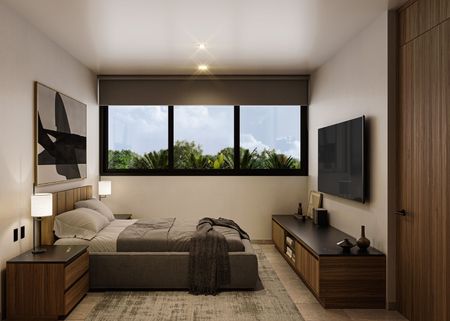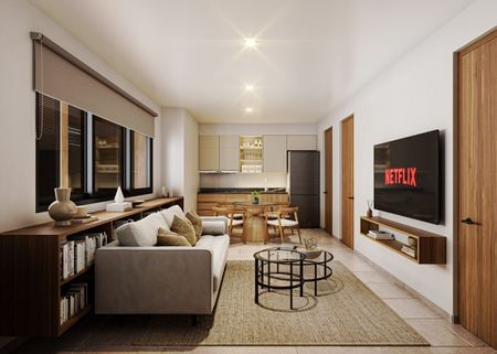- Parrilla eléctrica, - campana, - calentador eléctrico, - carpintería en cocina, - closets semivestidos, - cancel fijo de cristal templado, - mueble abajo lavabos, - paneles solares para áreas en común.