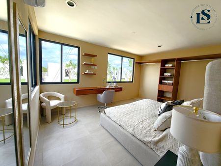 El modelo D es un prototipo de 3 amplias habitaciones con una distribución de sala y comedor corridos conectados a su amplia cocina con barra de granito y barra desayunadora
