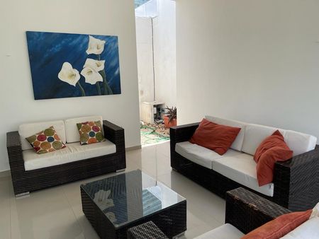 La casa es muy amplia y bien iluminada, con vistas a los jardines. Su doble altura la hace fresca y cuenta con aire acondicionado en todas las áreas.