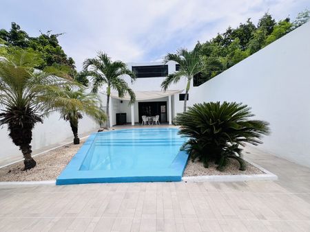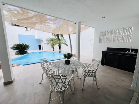 Al entrar a la propiedad hay un recibidor conectado con la sala por lo que parece muy extensa esa área y posteriormente está el comedor conectado con la cocina abierta que tiene una larga barra desayunadora hasta para 4 personas, debajo de las escaleras hay como un vestíbulo que se le puede dar diferentes usos. Un doble ventanal conecta para el área de la terraza donde hay un baño completo y una barra con fregadero. La alberca es de muy buen tamaño. Al fondo hay un cuarto de servicio con baño completo y en el segundo piso hay un área de tendido. Hay un garage techado para un auto.