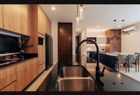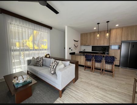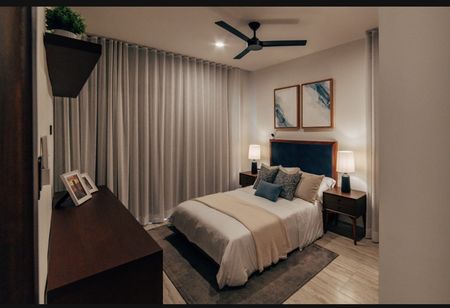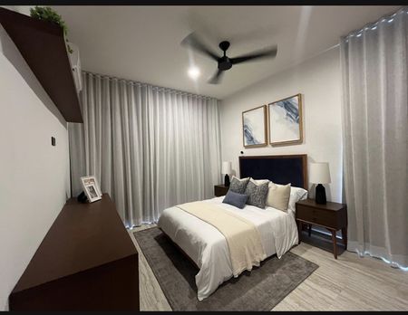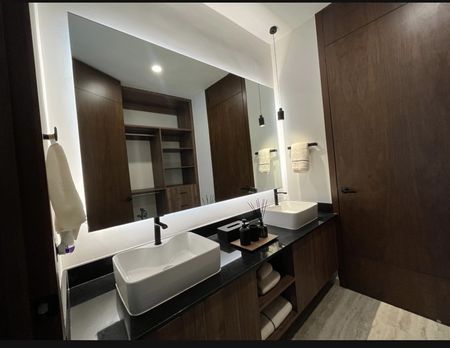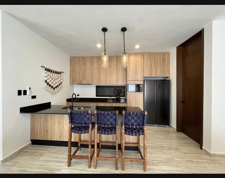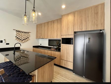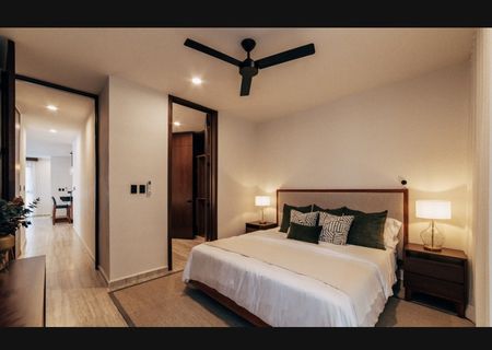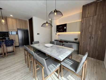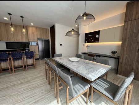 • Equipamiento: Meseta de granito en cocina, meseta de granito en baños, apagadores inteligentes en pasillo y recámaras, cerradura digital, calentador eléctrico, cristal templado en baños con puerta, closets vestidos, gabinetes inferiores y superiores en cocina, gabinetes inferiores en baños, parrilla eléctrica de inducción, campana, espejos en baños, accesorios en baño.