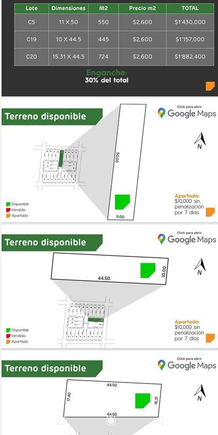 El Lote 20 de 15.31x44.5= 724 m2 precio por m2 $2,600