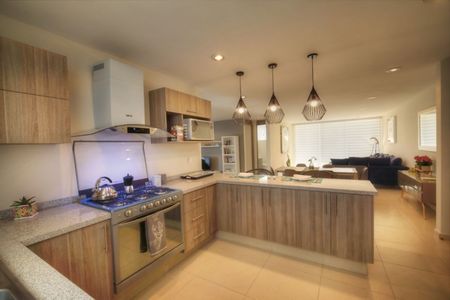 -Cocina equipada con estufa, campana, alacenas y cubierta de granito.