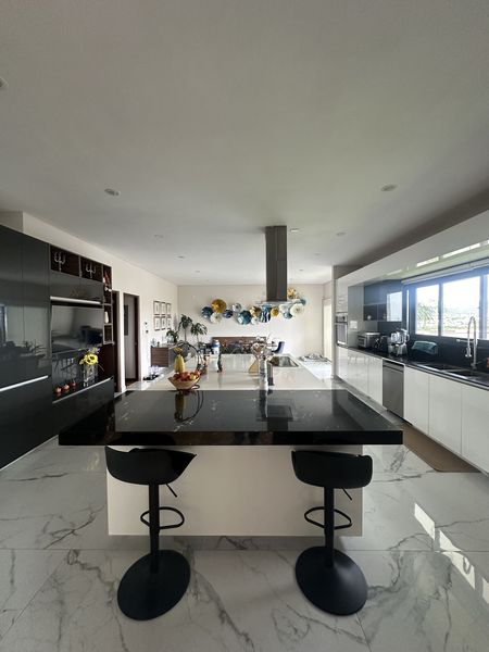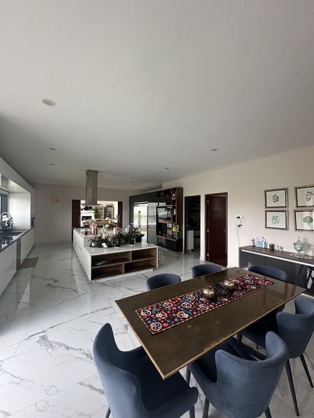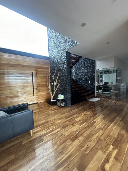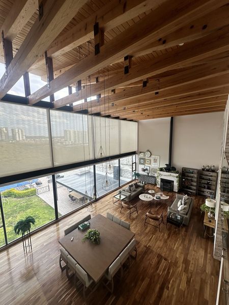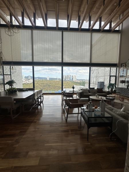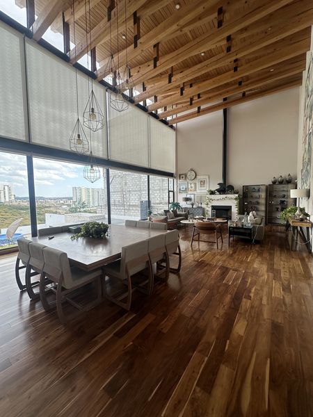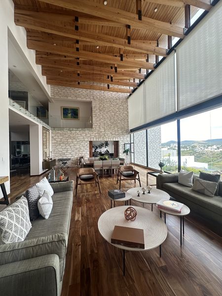Amplia Sala-Comedor doble altura con vista al jardín, la alberca y la cañada.