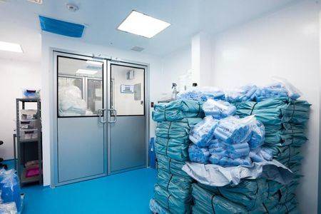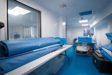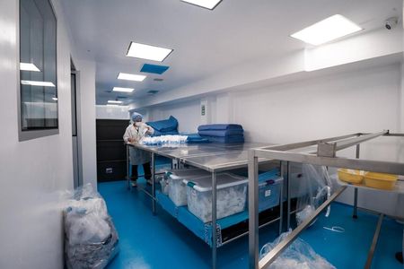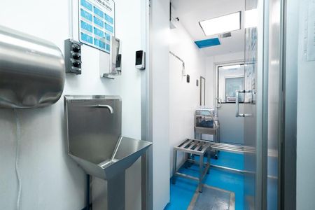 Cuarto limpio farmacéutico de 143.2 m2, Instalaciones tipo laboratorio con acabados sanitarios grado ISO 8 y 9 , Piso epóxico.