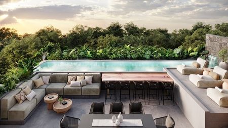 Este nuevo desarrollo cuenta con múltiples albercas, un bar en la azotea, un gimnasio y centro de bienestar, un área de yoga, un spa con sauna y más. El complejo es seguro con entrada cerrada y seguridad las 24 horas. Tiene un vestíbulo tipo hotel, una cafetería, elevadores, estacionamiento subterráneo y Wi-Fi en las áreas comunes. También ofrece tecnologías sostenibles como cargadores de autos eléctricos y paneles solares para energía verde.