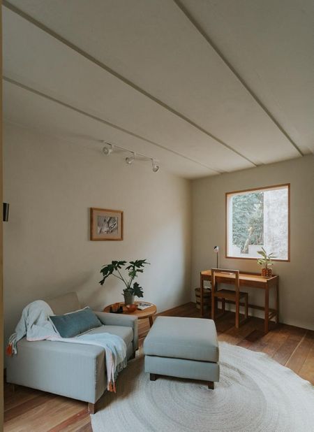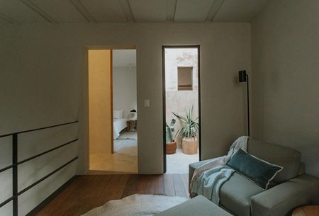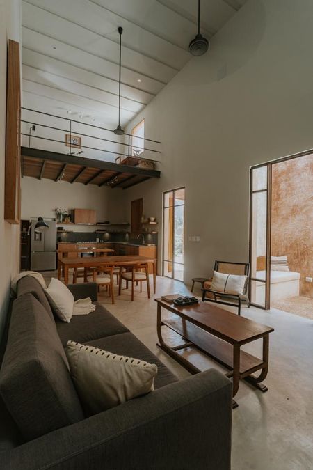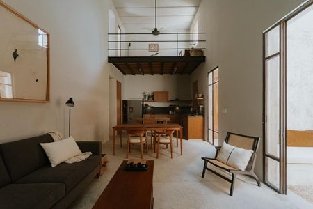 CASA 02 está distribuida en dos niveles, con patio interior para iluminar y ventilar. Las áreas comunes se diseñaron a doble altura con tapancos intermedios, lo que otorga una mayor calidad espacial. Las recámaras y baños se diseñaron pensando en la intimidad y el descanso (una recámara se encuentra en la planta baja, y la otra en el segundo nivel, junto con un área de estudio/tapanco).