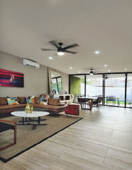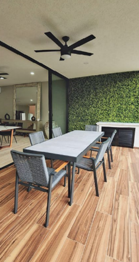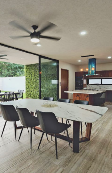 Sala y comedor con grandes ventanales con vista panorámica y salida directa a la terraza frente al espacioso jardín con alberca y fuente