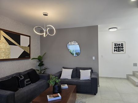cochera para 2 autos, 1/2 baño de visitas, área social, cocina, jardín y área de lavado