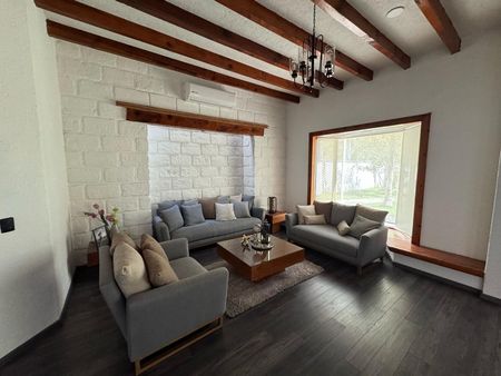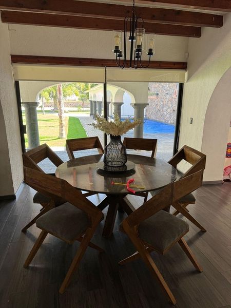 Nos recibe una cochera techada para 6 autos techados y otros 5 sin techar. Entrando a la casa nos recibe una doble altura con un estilo contemporáneo mexicano, medio baño para visitas, doble pasillo lateral con patio, estudio, cuarto de servicio, bodega y en el interior sala y comedor con cava.