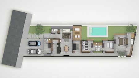Piscina de 2.50 x 6 mts. con acabado pulido chukum, luminaria LED, banca y escalones