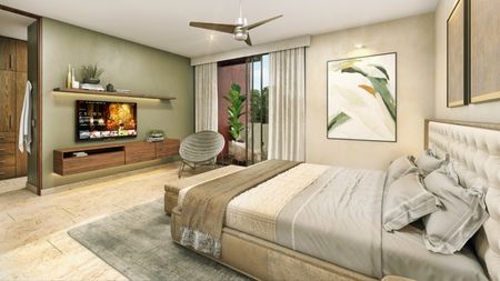 • Recámara principal con área de clóset vestidor (No incluye carpintería), baño completo y balcón