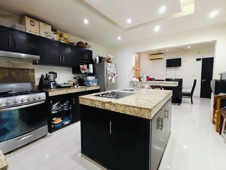 Cocina equipada con isla central, estufa eléctrica y triple tarja