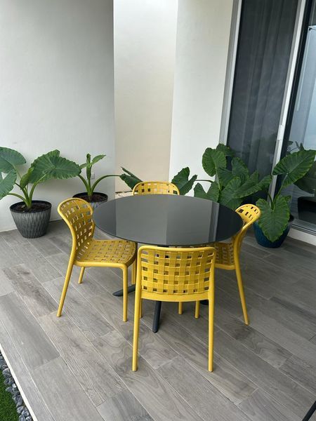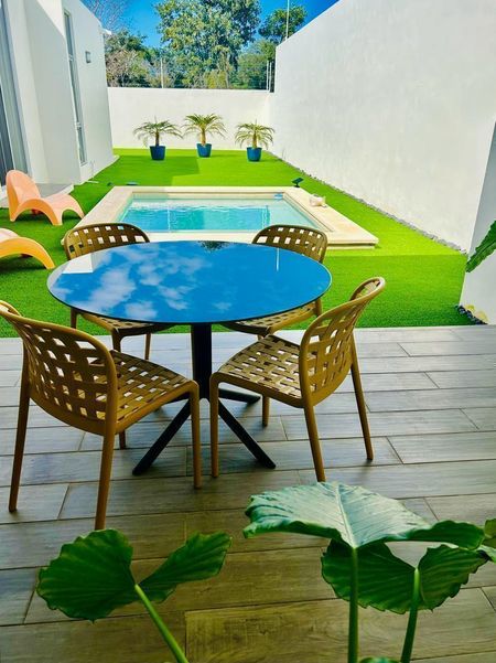 Casa en venta en conkal , casa completamente equipada lista para disfrutar , ubicada en una Privada ,completamente equipada , UNA sola planta , 3 recamaras , la principal con baño closet vestidor y doble lavabo , recamaras (2 ) secundarias cada una con baño y closets , sala a doble altura , comedor , medio baño de visitas , cocina equipada , amplio terreno (450 mts2 ) , Piscina , estacionamiento techado para 2 autos , terraza techada con meseta de granito ,jardin con pasto artificial ( olvidese de jardinero) ,cuarto de servicio .