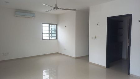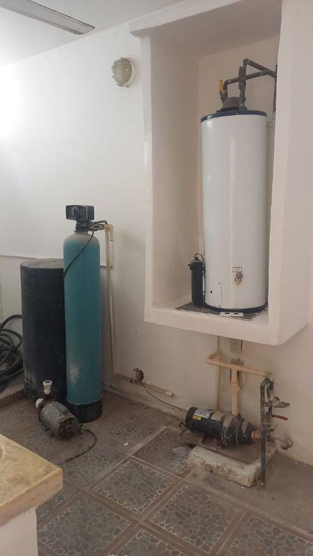 Patio terraza con gran piscina, salón de juegos con AA y ventiladores, baño para piscina.