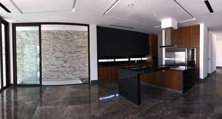 La planta baja tiene garage para 4 autos, jardín, terraza abierta, alberca infinity, jacuzzi, terraza techada, muelle para barco de 48", canal de agua con cascada a la alberca, escaleras al sótano, vestidor o vestíbulo, baño completo, sala de juegos o cine, cocina con barra desayunadora, despensa, sala con triple altura y comedor.