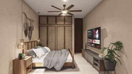 La estructura de la vivienda se conforma de muros de concreto y losas de vigueta y bovedilla con acabados de cemento y polvo en interiores y exteriores para una durabilidad extra en la playa, con pisos de 45 x 90 en color gris, mesetas de marmol crema maya, puertas de tzalam , aluminio de 6 mm, tipo madera y cubiertas de granito en cocina.