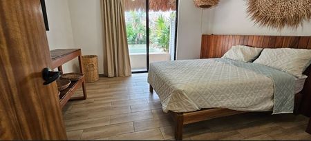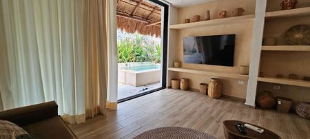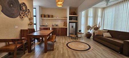 -Terraza techada con palapa de playa, comedor, hamacas y sillas de playa.