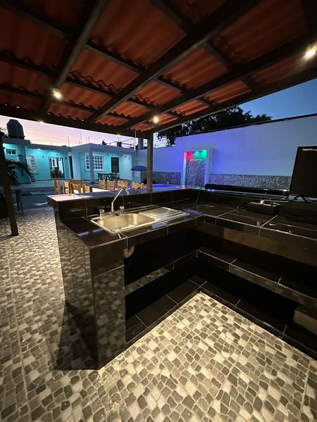 Sala comedor, Cocina con barra con loseta y niveles, recién remodelada., Medio baño de visitas, 1 habitación con clóset que sale a la sala, 1 habitación con baño completo, Baño completo en área social, Terraza techada, Terraza con piso, Alberca de 7.5m x 4.5m y 1.5h con acabado chukum, fuente e iluminación
