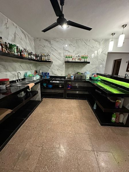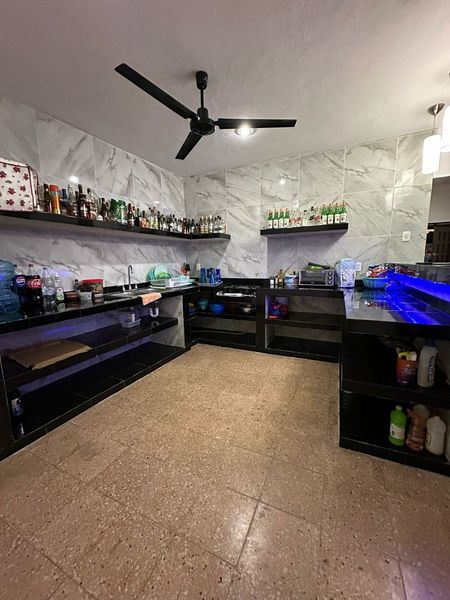 Bar con barra techado con tejaban, tarja y niveles debajo de barra (todo enlosado)