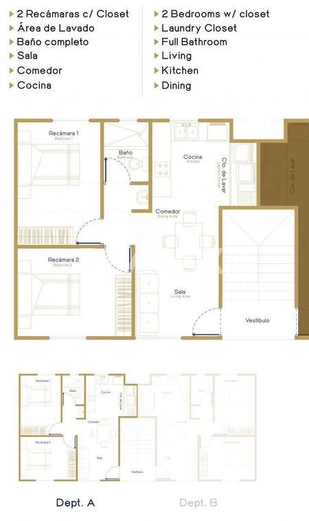 Departamento en condominio tipo vertical cuenta con 2 Recámaras c/ Closet, 1 baño completo, Área de Lavado, sala, comedor y cocina, todos los departamentos cuentan con: Área de Lavado, Azulejo en áreas húmedas, Plafón rígido sobre cocina (pintado blanco), Aislamiento acústico entre losas, Aislamiento térmico por exterior, las amenidades con las que cuenta son: Club Social con gym, terraza y área de asador, Áreas verdes, Pasillos arbolados, Área de delivery / Buzón general, 2 Cajones de estacionamiento, Acceso controlado, Cerco electrificado, Asociación civil. en total son 11 torres de 3 niveles cada una. CONSTRUCCION: 54.49 M2 ESTACIONAMIENTO: 28.62 M2 TORRE 1 - NIVEL 2 - UNIDAD 201 - MODELO SAHUARO