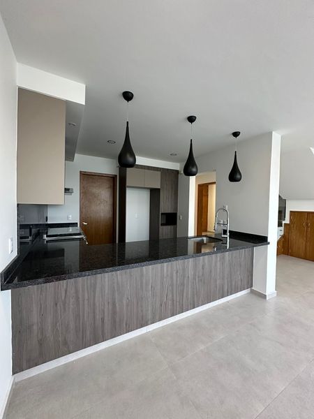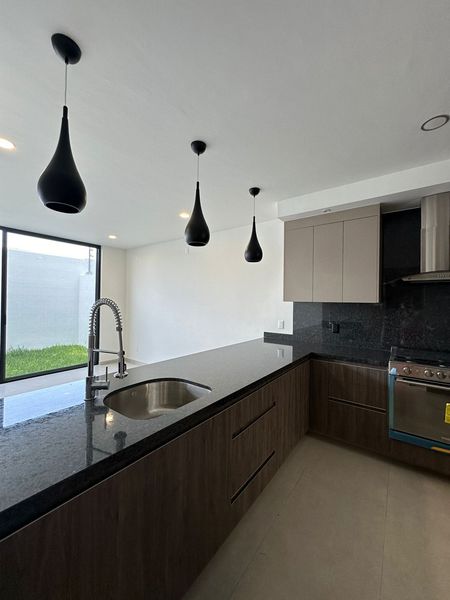 Cocina integral con cubierta de granito, barra desayunadora, tarja, horno eléctrico y horno de microondas