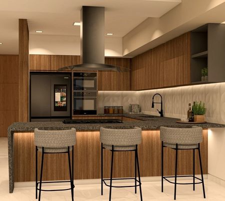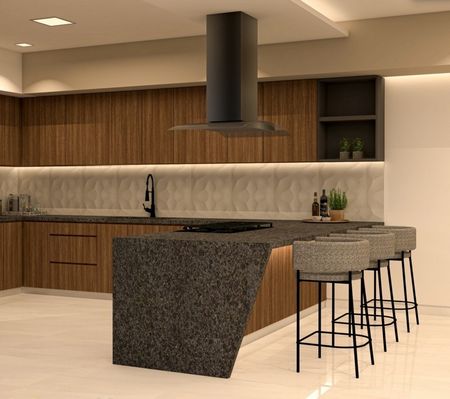 Cocina con barra de granito y melamina con acabados de maderas naturales de tzalam.
