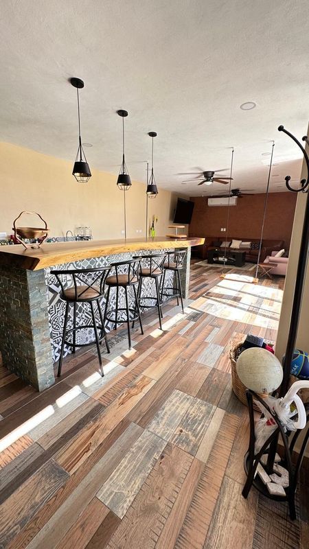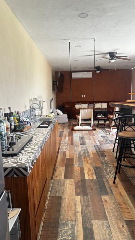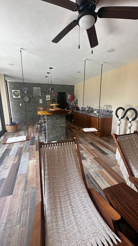 Área techada y grande de bar con área de sala, columpios, barra de parota para 10 personas, baño con regadera.