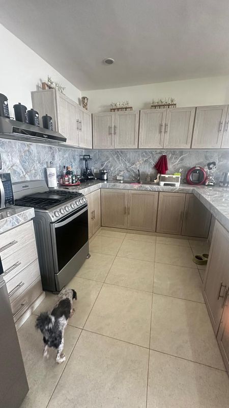 Sala, comedor, cocina integral, medio baño, cuarto de lavado y alacena, cuarto de servicio con baño, bodega bajo escalera.