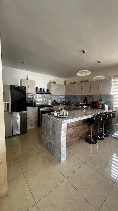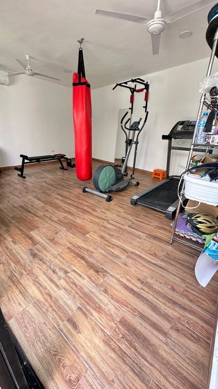 Toda la casa tiene aires acondicionados; ventiladores en recamara principal, bar, gimnasio y terraza; persianas en recamaras, sala y bar.