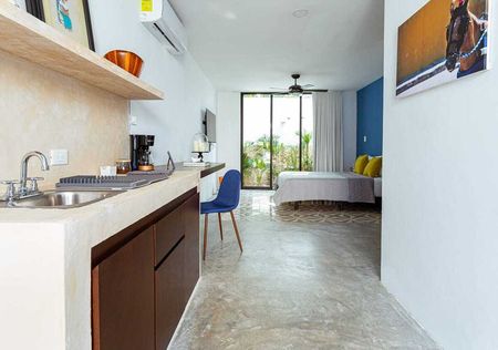 *Recámara con cocineta y baño completo, closet empotrado de madera