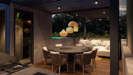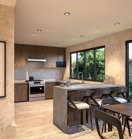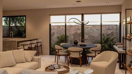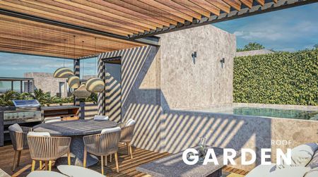 Presentamos HARMONY, un diseño de residencia de 208.00 m² que encapsula la esencia del lujo y confort. En el primer nivel, se destaca un lobby de recepción elegante, seguido de una sala y comedor amplios, cocina equipada, medio baño para visitas, área de lavado, un jardín para momentos de paz y dos cajones de estacionamiento. El segundo nivel alberga la recámara principal con baño completo y tocador con doble ovalín, closet y terraza, además de dos recámaras adicionales, cada una con closet y baño completo. La experiencia se completa con un roof garden que incluye alberca, asoleadero y área social con sala-comedor y medio baño, perfecto para entretenimiento y relajación. Harmony es la definición de una vida equilibrada y sofisticada.