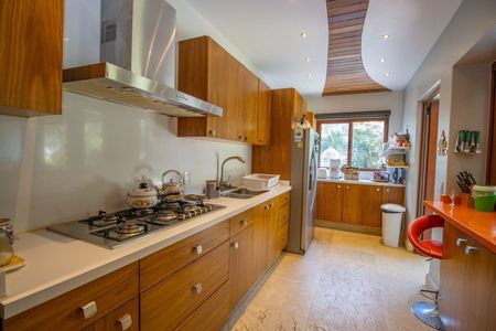 Cocina integral con acabado de madera de tzalam y cubiertas de cuarzo