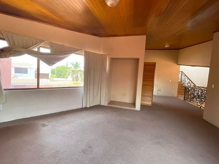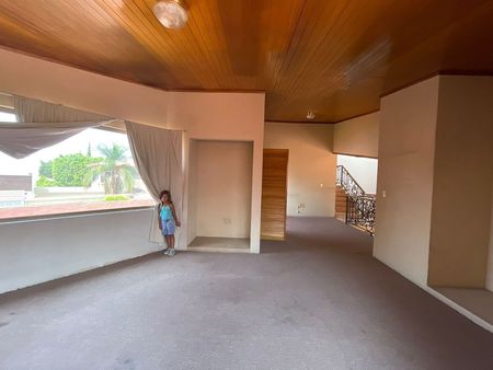 La casa muy amplia, los espacios con una distribución muy bien pensada. Entrando a la propiedad por la puerta principal, se encuentra un recibidor con un estudio y medio baño de visitas, sala y family room, comedor independiente, y la cocina cerrada con buen espacio y alacena.