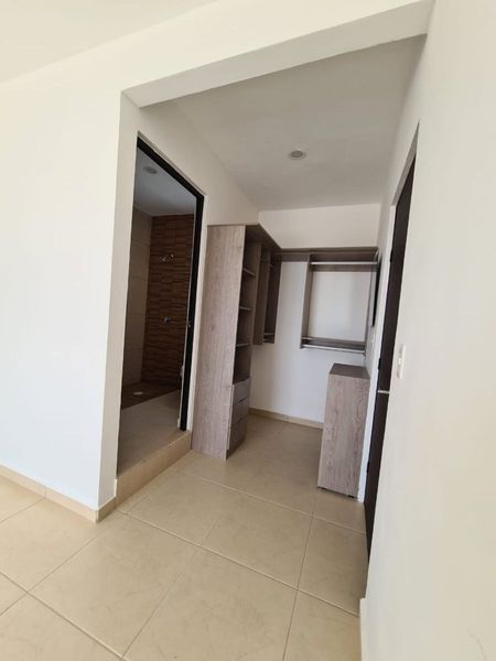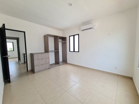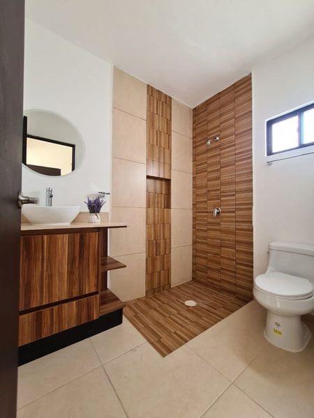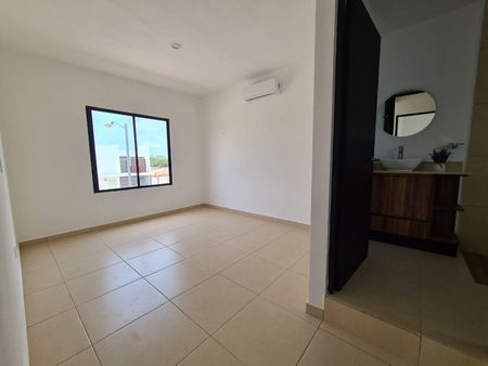 Casa de dos plantas y cuatro recámaras (una en planta baja) en privada con amenidades, entre ellas, alberca, gimnasio y salón de usos múltiples. Esta residencia se encuentra en Conkal al norte de Mérida.