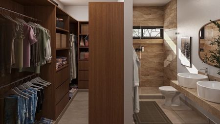 Recámara principal con área de clóset vestidor, baño propio y balcón.