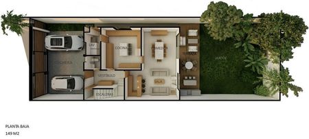 PLANTA BAJA: Cochera para 3 carros, 1 puertas de servicio y 1 puerta principal. Vestíbulo, Sala, Comedor, Bar, Cocina, Baño de Visitas, Lavandería, Terraza y Jardín.
