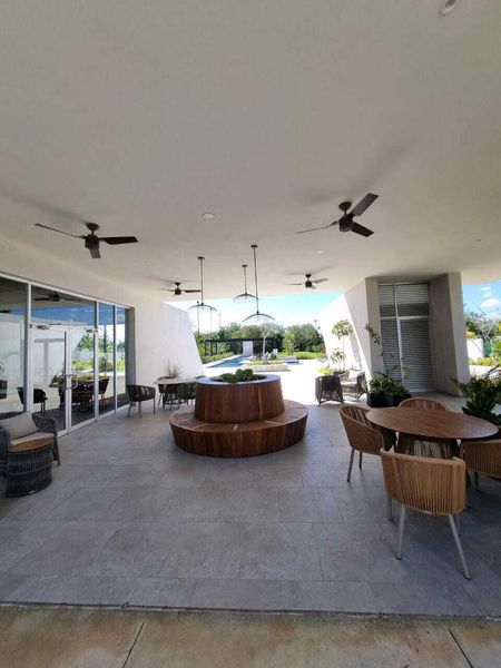 - Sala - comedor a altura y media con vista a la terraza y piscina.