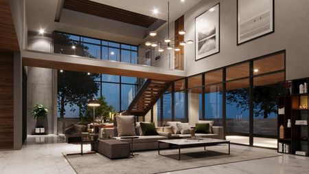 Descubre esta espectacular residencia con diseño moderno, acabados premium y vistas inigualables que te conectan con lo mejor de la ciudad y la naturaleza. Fachada principal con vista hacia el Skyline de Andares