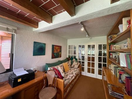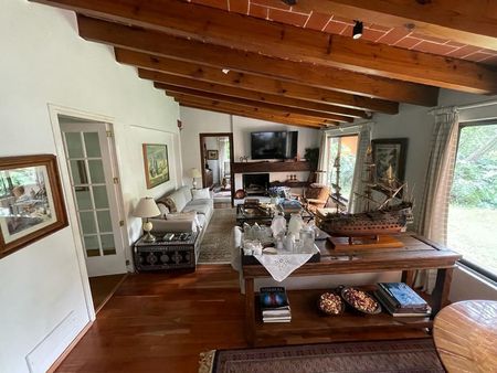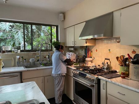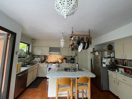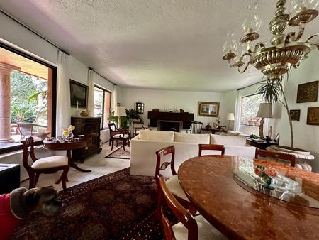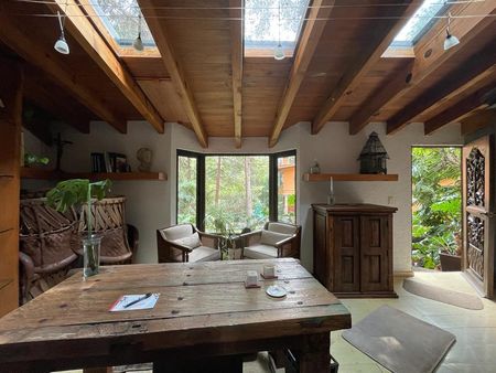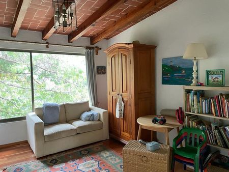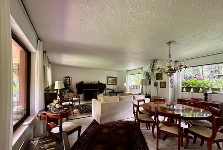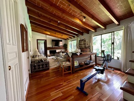 4 recámaras, 4 baños, medio baño, sala, comedor, cocina integral, lavandería, estudio, family room, despacho con entrada independiente, cuarto de servicio, garage para 6 autos, terraza con acceso a jardín, bodega, celdas soldares, cisterna, riego por aspersión, puertas automáticas, alarma, seguridad alta, acceso a barranca de 3,000 m2 con caminos, bancas, cancha fut, edad 40 años.