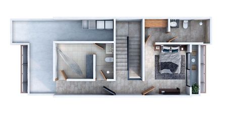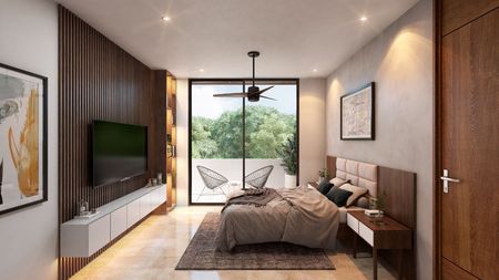Recámara principal con clóset vestidor, baño completo y área de balcón
