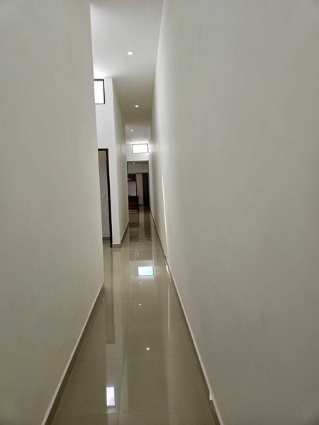 Sala y comedor con doble altura y pasillo de distribución hacia las recámaras.