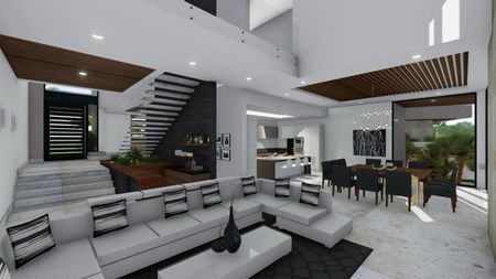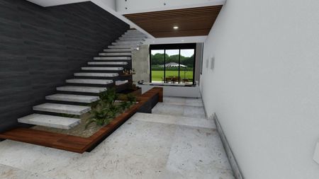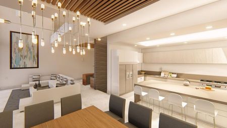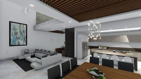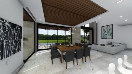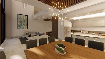 La planta baja es un lugar lleno de luz con pisos de mármol y ventanales de doble altura con vidrio anticiclónico, cocina estilo europeo, la sala, el comedor tienen acceso a una terraza exterior techada y al jardín. Esta área social conecta con la alberca.