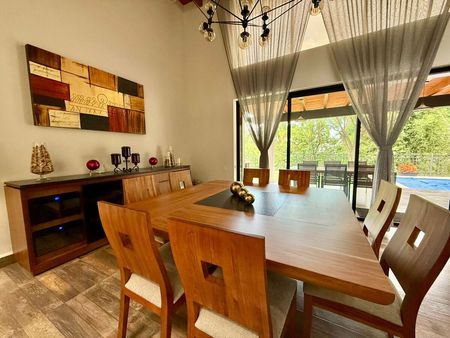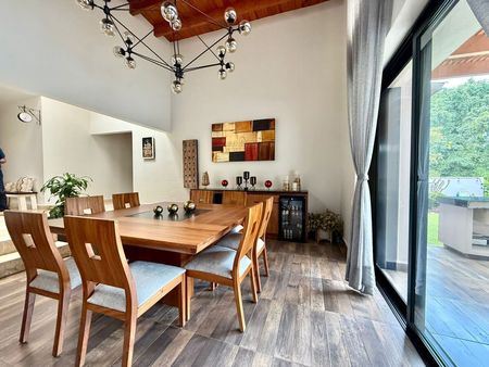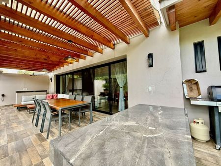 Amplia terraza para la parte social rodeada de vegetación y jardines, en un clima fresco y agradable. Cuenta con una barra muy cómoda para preparar alimentos y bebidas.